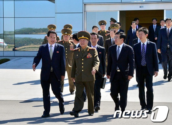 북한 김정은 국방위원회 제1위원장의 특사로 방중한 최룡해 인민군 총정치국장이 베이징 서우두 공항에 도착한 직후 중국 정부 관리의 영접을 받으며 귀빈실로 향하고 있다. © AFP=News1