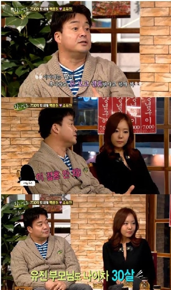 백종원은 “15살 연하와 만난다고 했을 때 집에서 완전히 경사가 났다”며 “연예인이라는 말에 얼굴빛이 변하시긴 했지만 만나자마자 소유진을 마음에 쏙 들어하셨다”고 입을 열었다.