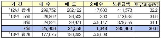 금융감독원은 7월 외국인 증권투자 동향 분석을 통해 지난달 외국인은 1조3000억원 규모의 주식을 순매수했다고 7일 밝혔다. 지난달 5조1470억원 규모의 주식을 팔아치운지 한 달 만에 매수세로 돌아선 것이다.