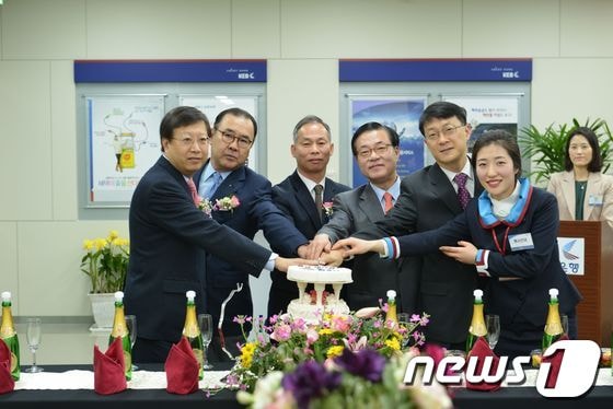 18일 외환은행 센텀시티지점 개점식에서 신현승 영업총괄그룹 부행장(사진 오른쪽에서 세번째)이 참석한 내외빈 축하객들과 개점 축하 케잌을 자르고 있다.© News1