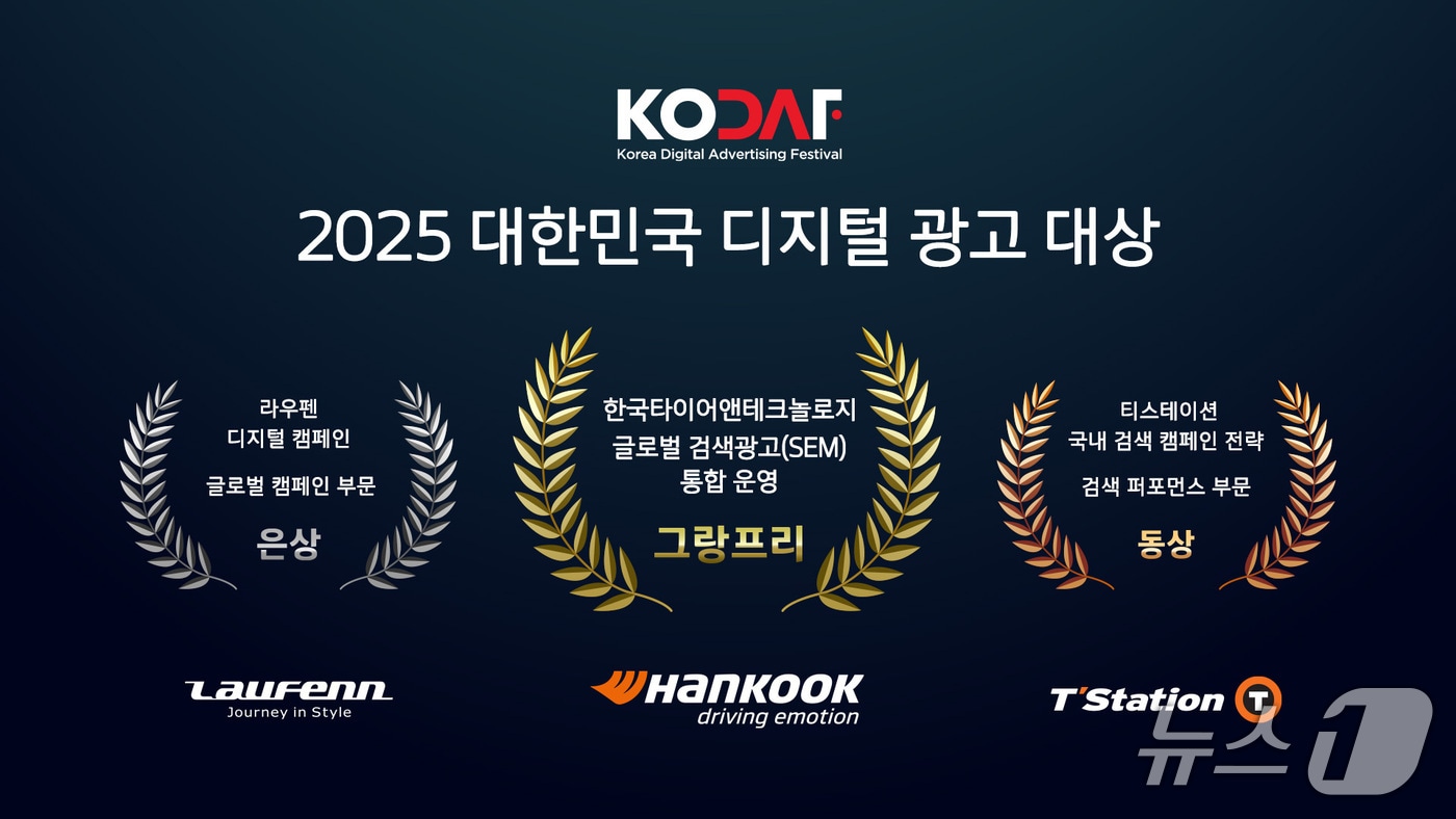 (서울=뉴스1) 박기범 기자 = 한국타이어앤테크놀로지(161390)는 11일 개최된 '2025 대한민국 디지털 광고대상' 시상식에서 최고 영예인 '그랑프리'를 비롯해 3개 부분에서 수상했다고 밝혔다.