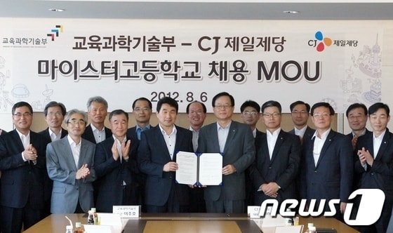 CJ제일제당은 교육과학기술부와 6일 중구 쌍림동 CJ제일제당 빌딩에서 김철하 대표이사와 주요 경영진, 이주호 교육과학기술부 장관, 마이스터고등학교장 6명 등이 참석한 가운데 마이스터고등학교 고졸 우수 인력확보를 위한 업무 협약을 체결했다고 밝혔다.