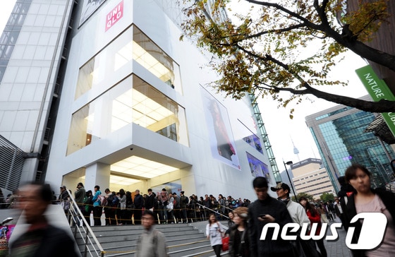 글로벌 SPA브랜드 유니클로(UNIQLO)의 글로벌 플래그십 스토어 명동 중앙점에 고객들이 매장에 입장하려고 길게 줄을 늘어서 있다. © News1 오대일 기자