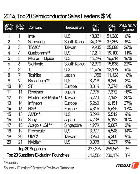 비메모리와 메모리 반도체를 통합해 시장점유율 추이를 따지면 인텔이 압도적인 1위를 유지하고 있다. 시장조사기관 IC인사이츠에 따르면 인텔의 지난해 매출은 513억달러로 1위를 차지했다. 삼성전자는 뒤를 이어 372억달러, TSMC는 250억달러, 퀄컴은 191억달러로 뒤를 잇는다.