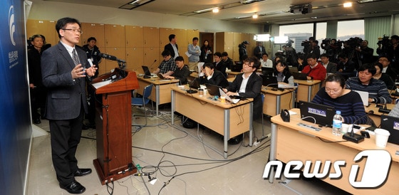 22일 오후 서울 종로구 방송통신위원회에서 한국인터넷진흥원(KISA) 이재일 인터넷침해대응센터 본부장이 KBS·YTN·MBC 등 방송사 및 금융기관 해킹사고 추가 브리핑 중 농협 전산 마비를 일으킨 악성코드가 중국IP를 통한 것이 아닌 국내 사설 IP로 확인됐다고 밝히고 있다. 2013.3.22/뉴스1 © News1 안은나 기자
