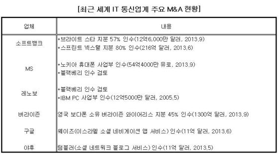 업계에선 새로운 먹거리 창출에 목마른 IT 통신업계의 M&A는 갈수록 활발해질 것이란 진단이다. 세계적 컨설팅 업체인 딜로이트의 리처드 로이드 오웬 M&A 팀장은 "글로벌 기업들은 이미 많은 현금을 확보하고 있는 상태"라며 "(가파르게 성장하고 있는) IT업계를 중심으로 대규모 M&A가 이뤄질 것"이라고 내다봤다.