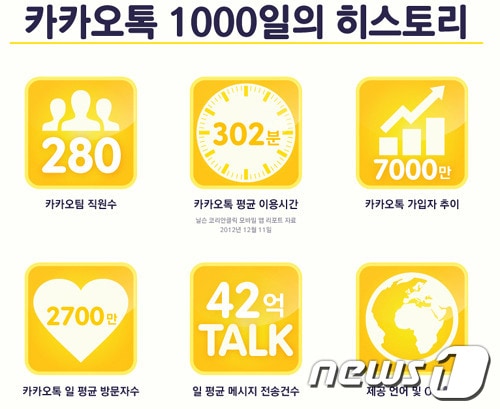 카카오톡의 일평균 방문자수는 2750만명, 가입자수는 12월 기준 7000만명으로, 지난 9월 6000만명을 돌파한지 석달만에 1000만명이 더 늘어난 것으로 조사됐다.