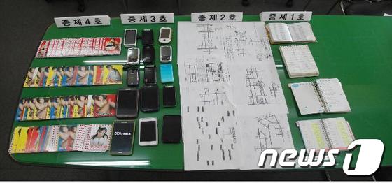 성매매 알선 조직으로 압수한 전단지와 대포폰, 모텔비치도 등 증거물/사진제공=대구경찰청© News1