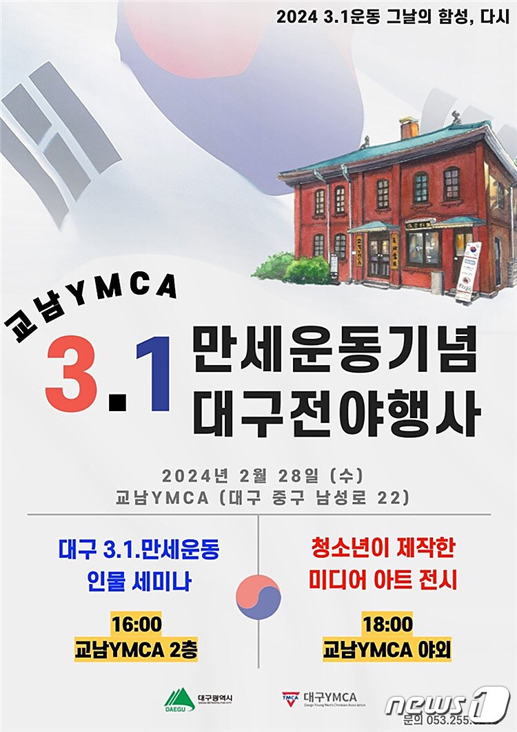(대구=뉴스1) 공정식 기자 = 대구YMCA는 27~28일 이틀간 인물 세미나와 미디어 아트를 통해 3·1만세운동을 기념하고 숭고한 정신을 계승한다고 밝혔다.