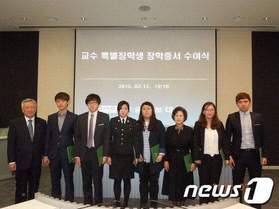김선종 우송정보대 총장(사진 왼쪽)이 12일 교수들을 대신해 '제자사랑 장학금'을 전달했다. © News1