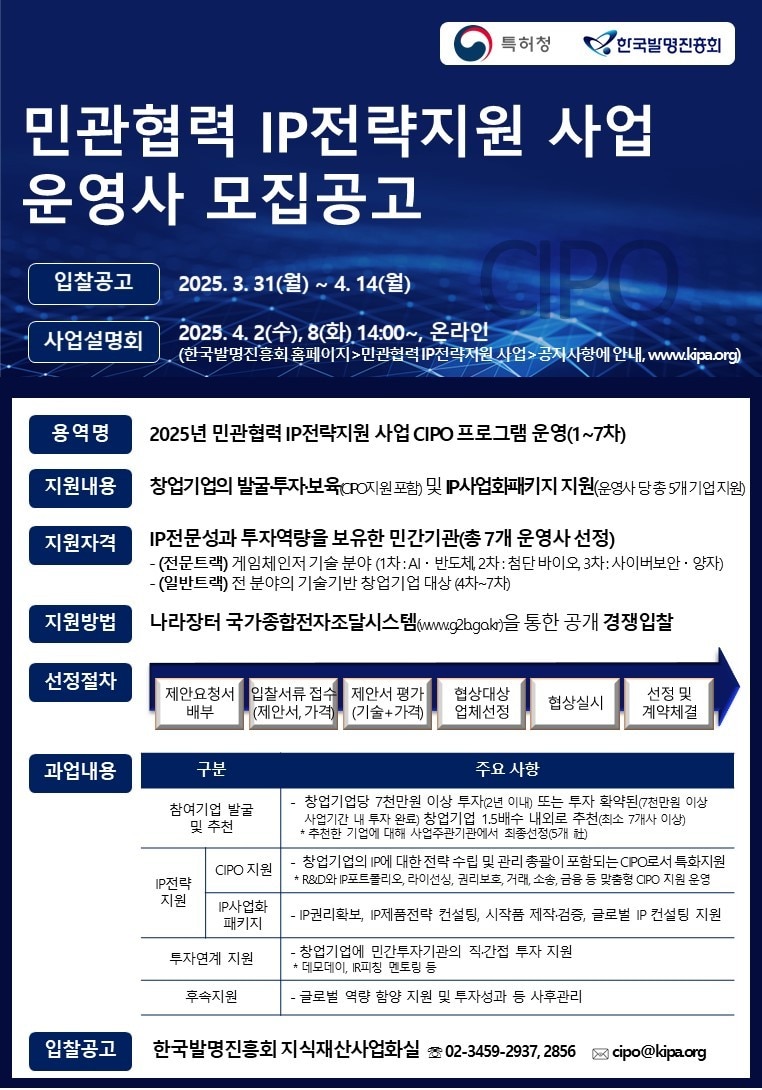 (대전ㆍ충남=뉴스1) 박찬수 기자 = 특허청은 31일~4월 14일 ‘민관협력 IP전략지원 사업’에 참여할 민간 투자기관(이하 민간 운영사)을 모집한다고 30일 밝혔다.