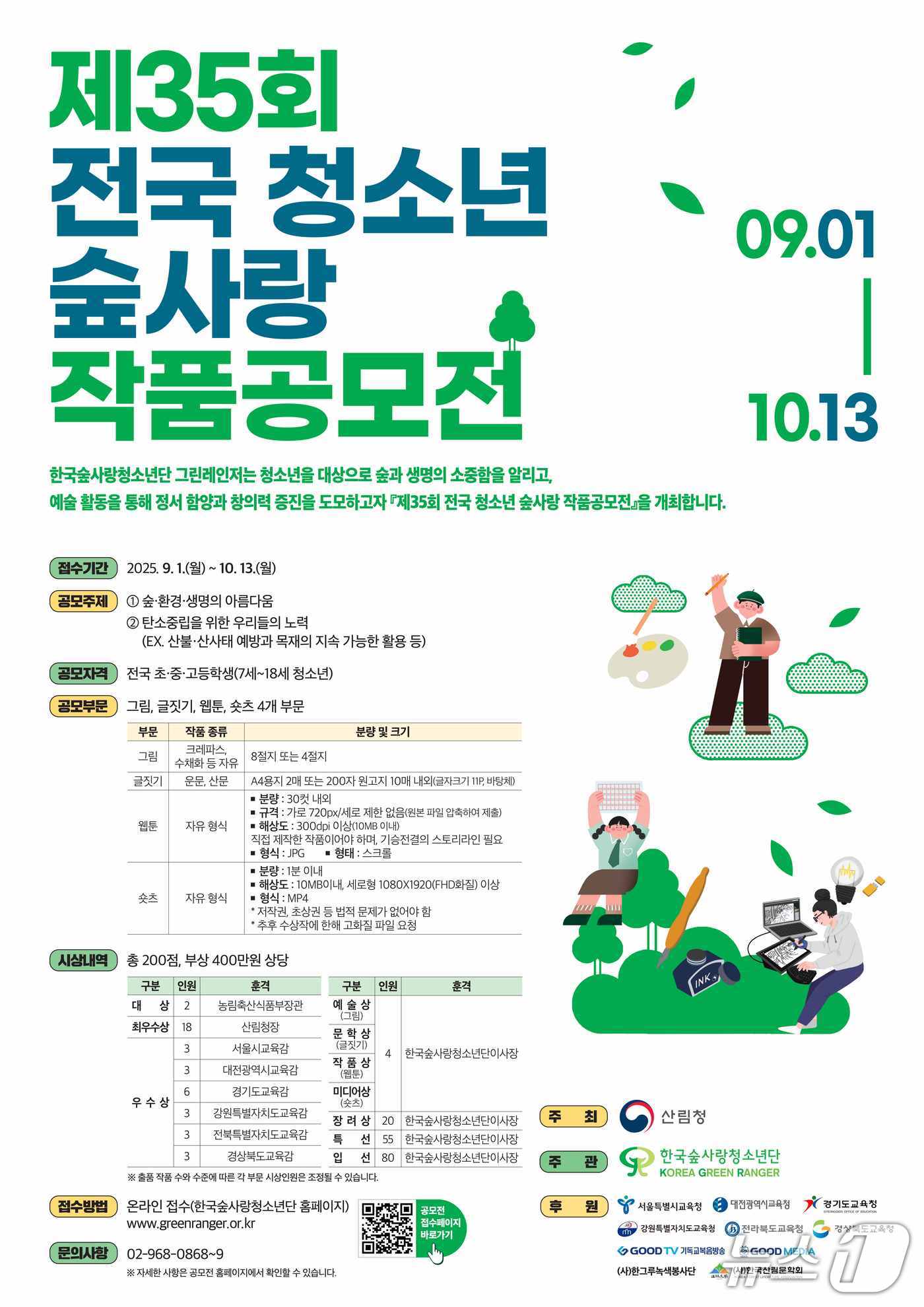 송준호 산림청 산림복지국장은 “이번 공모전은 단순한 작품 응모를 넘어, 청소년들이 숲을 바라보며 자연의 숨결과 생명의 소중함을 마음에 새기는 시간이 되기를 바란다”며 “작품을 통한 청소년의 창의적인 아이디어가 기후 위기 극복은 물론 산불·산사태 등 산림재난 예방에도 도움이 될 것으로 기대한다”라고 밝혔다.