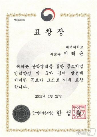 대덕대 정밀기계공학과 이태근 교수, 중기부 장관 표창