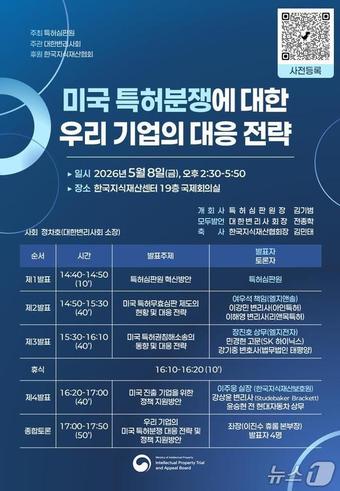 (대전=뉴스1) 박찬수 기자 = 지식재산처 특허심판원은 5월 8일 오후 2시30분 한국지식재산센터(서울 강남구)에서 '미국 특허분쟁에 대한 우리 기업의 대응전략' 세미나를 개최한다고 26일 밝혔다.