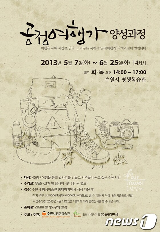 경기 수원시는고용창출과 지역경제활성화를 위해 '공정여행가 양성과정'을 운영한다고 14일 밝혔다.