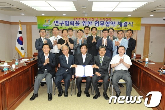 경기 수원시는 10일 시청에서 국토연구원, 수원시정연구원과 '수원비행장 미래비전 및 도시정책 연구협력을 위한 협약식'을 맺었다.