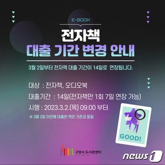 (고양=뉴스1) 박대준 기자 = 경기 고양시 도서관센터는 오는 3월 2일부터 전자책·오디오북 대출 기간을 기본 14일로 늘린다고 24일 밝혔다.
