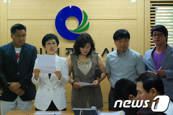 10일 인천시 학교운영위원연합회가 인천시청 브리핑룸에서 ‘송영길 시장님! 이 내용이 사실입니까?’라는 제목의 성명을 발표하고 있다. © News1