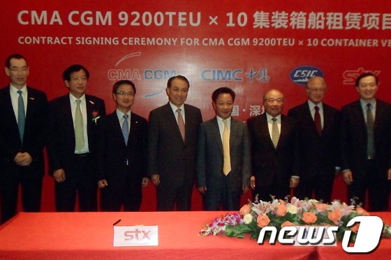 STX다롄은 22일 중국 심천 인터컨티넨탈호텔에서 강덕수 STX그룹 회장, 잭 사데 CMA CGM 회장, 마이 보 량 CIMC 사장을 비롯한 주요 관계자가 참석한 가운데 CIMC(China International Marine Containers)와 총 3억3000달러 규모의 9200TEU급 대형 컨테이너선 4척에 대한 건조 계약을 체결했다고 23일 밝혔다.