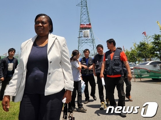 마가렛 세카기야 유엔 인권옹호자 특별보고관이 3일 오전 인권탄압 실태를 조사하기 위해 현대자동차 울산공장 명촌주차장 비정규직 철탑농성장을 찾았다. 2013.6.3/뉴스1 © News1 노화정 기자