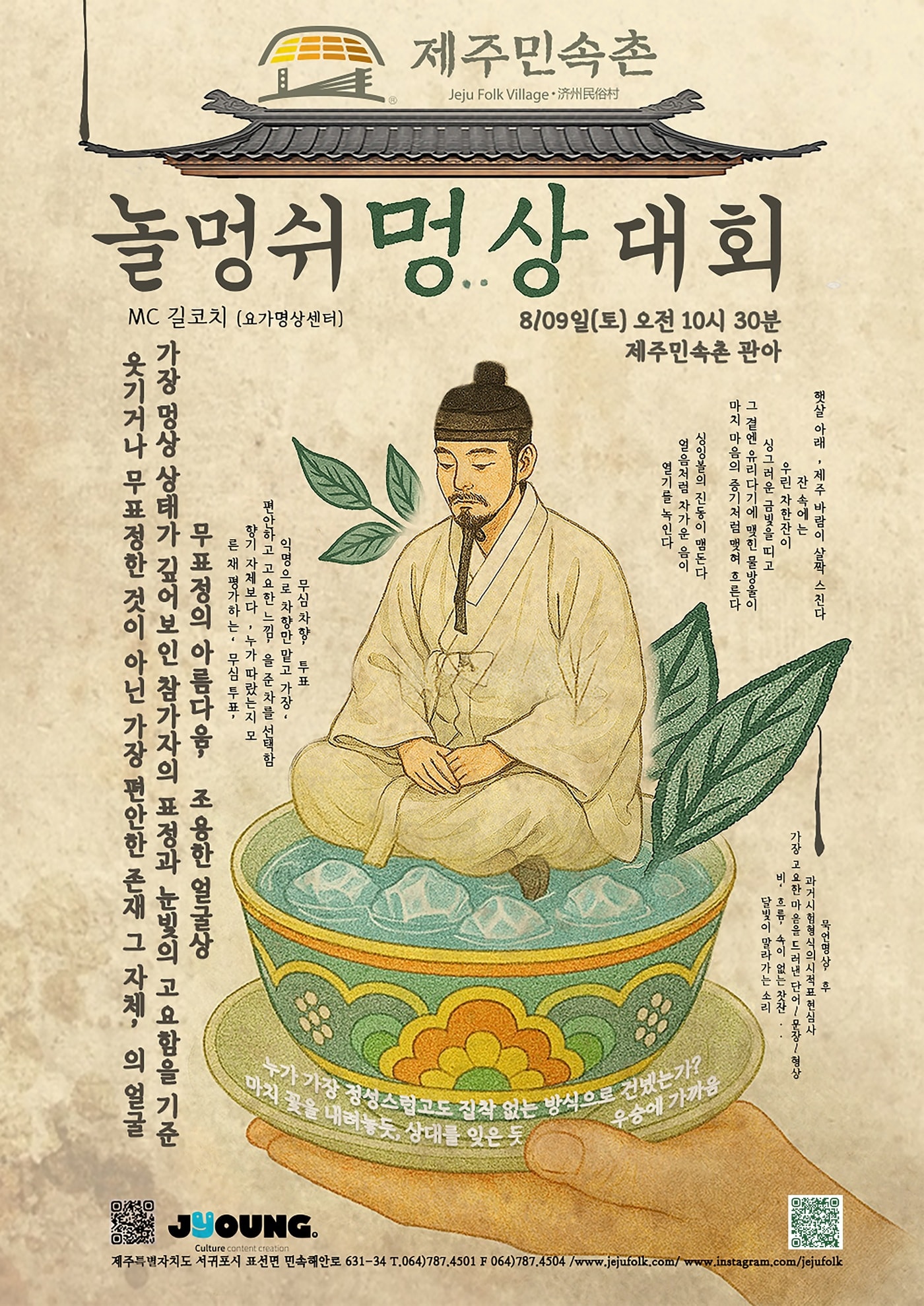 멍때리기를 제주식 웰니스 체험으로 재해석한 이 대회는 △무위의 손 퍼포먼스 : 떨림 없이 차 따르기 △차를 건네는 무심의 자세 △묵언 명상과 초현실 시 쓰기 △무표정의 아름다운 대결 △싱잉볼과 국화·백년초 냉차 테라피 등의 프로그램으로 진행된다.