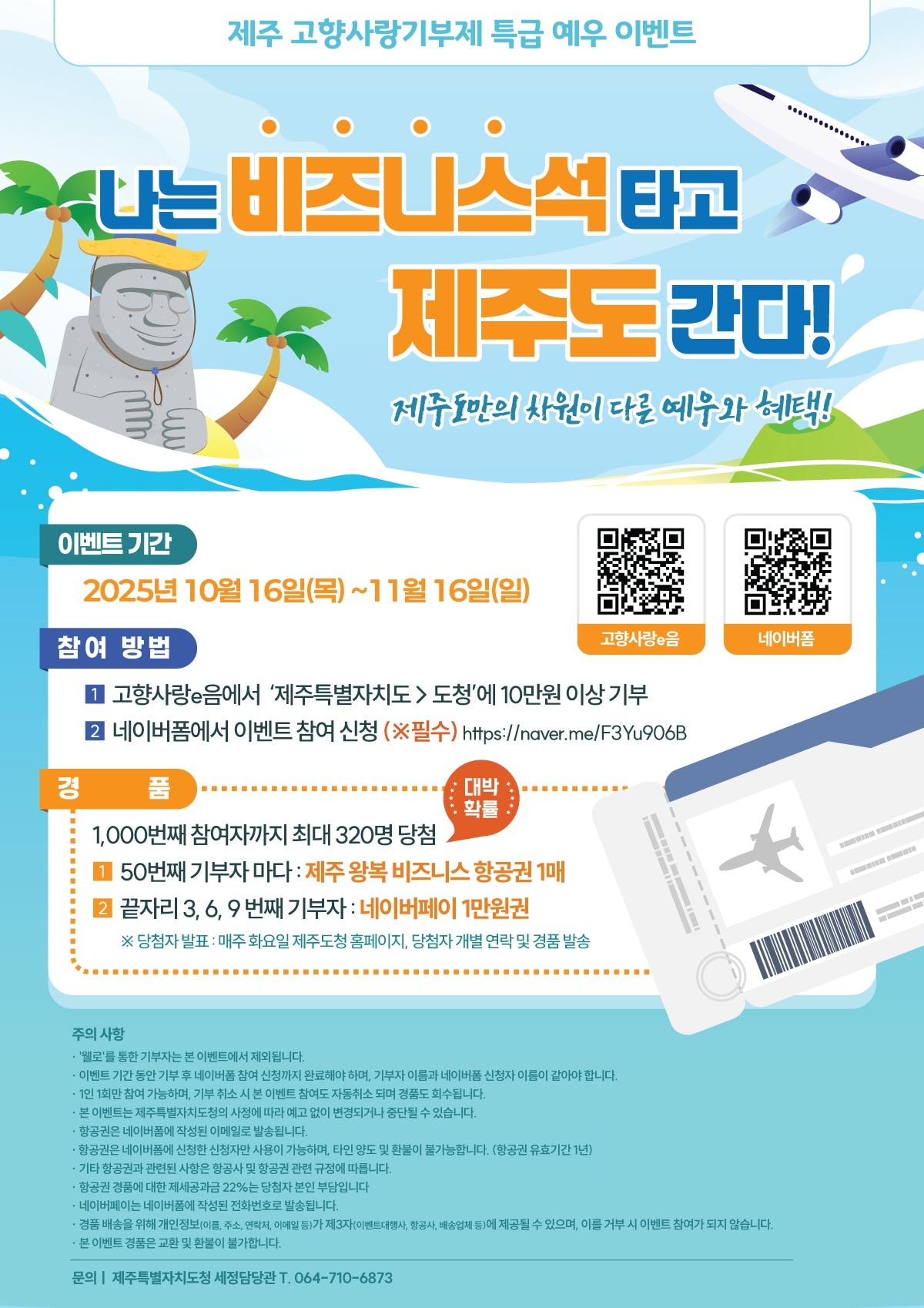 (제주=뉴스1) 오미란 기자 = 제주특별자치도는 다음달 16일까지 한 달간 제주 고향사랑기부제 활성화를 위한 '나는 비즈니스석 타고 제주도 간다!' 이벤트를 진행한다고 16일 밝혔다.