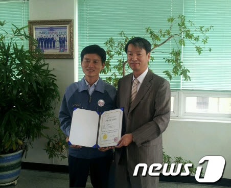중진공 전북본부는 10일 (주) 아이씨엠씨를 으뜸기업으로 선정하고 인정서를 전달했다. 왼쪽 아이씨엠씨 임철영 대표, 오른쪽 조내권 전북본부장./사진제공=중진공 전북본부© News1