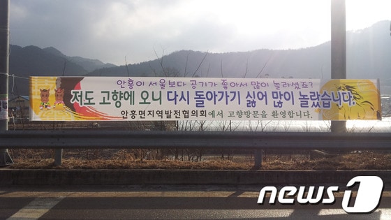 현수막 문구는 '차가 많이 밀려도, 눈이 많이 왔어도 그리운 고향생각 한달음에 옵니다', '로또 대박은 못 맞아도, 내고향 안흥에 오니 좋기만 하네! 쿄쿄쿄쿄', '안흥이 서울보다 공기가 좋아서 많이 놀라셨죠? 저도 고향에 오니 다시 돌아가기 싫어 많이 놀랐습니다' 등이다.