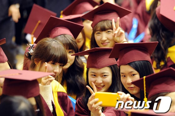 7일 오후 충북 청원고등학교에서 열린 제4회 졸업식에서 졸업생들이 학사모를 쓰고 기념촬영을 하고 있다. 이 졸업식에선 졸업생 1명씩 단상에 올라 교장으로 부터 졸업장, 1만원이 입금된 희망통장, 꽃 한송이를 선물받았다. 2013.2.7/뉴스1 © News1 김용빈 기자