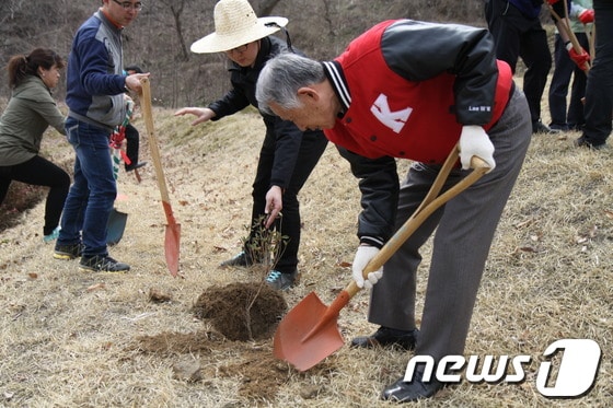 이원우 꽃동네대 총장이 직원 및 학생들과 함께 나무를 심고 있다. 사진제공=꽃동네대학교/© News1