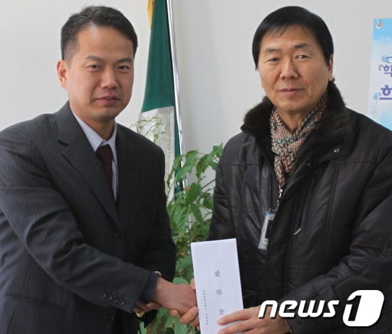 손익진 세명대학교총동문회장이 제천시 송학중학교를 찾아 교복상품권을 전달하고 있다. 사진제공=세명대학교총동문회. © News1