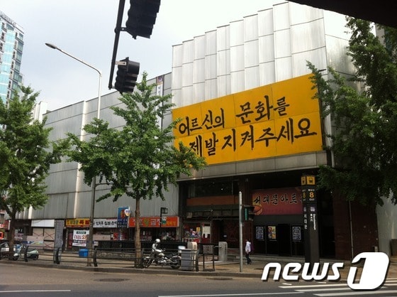 서대문 아트홀에 걸려있는 현판. '어르신의 문화를 제발 지켜주세요'라는 문구가 애처롭기까지 하다. © News1 (정이나 기자)