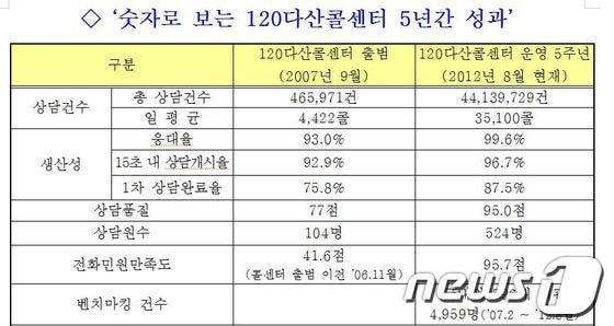서울시는 2007년 출범한 전화민원서비스 120다산콜센터 5주년을 맞아 '숫자로 본 120다산콜센터 5년 성과'를 13일 발표했다.