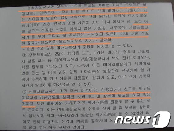 최종 보고서의 ‘조사자 총평’은 조사 대상이었던 황모 교사의 진술을 바탕으로 ‘생활지도교사가 성폭력 보고를 받고도 가벼운 조치로 오랫동안 이용자들이 성폭력에 노출되게 해 이른바 성폭력이 대물림됐다’고 밝히고 있다.