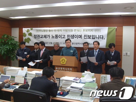 김진영(왼쪽 세번째) 울산시의원 등 민노당 출신 전ㆍ현직 지방의원 10여명이 4일 울산시의회 프레스센터에서 기자회견을 갖고 민주통합당 문재인 후보에 대한 지지를 선언하고 있는 가운데 서영택(가운데) 전 동구의원이 회견문을 읽고 있다.© News1 이상길 기자