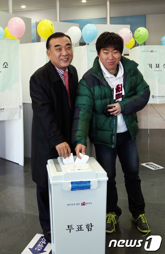 제18대 대통령 선거일인 19일 김두겸 울산 남구청장이 울산대공원 내 행복한공원문고에 설치된 옥동 제6투표소에서 큰 아들 김재국씨와 투표를 하고 있다.