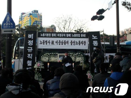 26일 오전 울산 현대중공업 정문 맞은편에서 사내하청지회(하청노조) 노조간부 출신 고 이운남(42)씨의 영결식이 열렸다. 이씨는 22일 오후 5시 30분께 울산시 동구 자신의 아파트 19층에서 투신 자살했다. 사진제공=독자 조용식씨 © News1