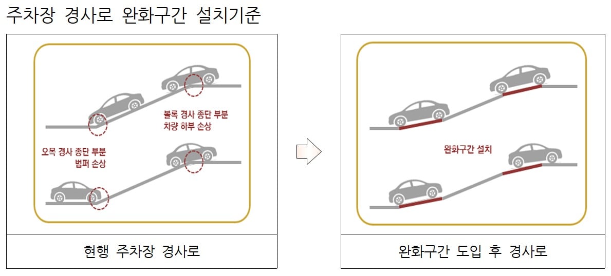 기존에는 주차장 설치기준 중 경사로 완화구간에 대한 규정이 없었다. 이로 인해 경사로를 통행하는 차량 하부가 경사로 종점 구간에 부딪히거나 주차장 출차 시 운전자 시야제한으로 출입구 전면을 통행하는 차량이나 사람과의 접촉사고가 발생할 우려가 있었다.