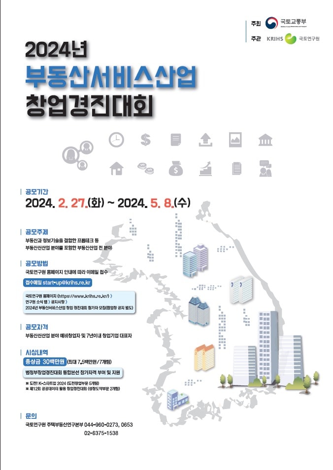 (서울=뉴스1) 신현우 기자 = 국토교통부는 국토연구원과 함께 ‘2024 부동산서비스산업 창업경진대회’를 개최한다고 27일 밝혔다.