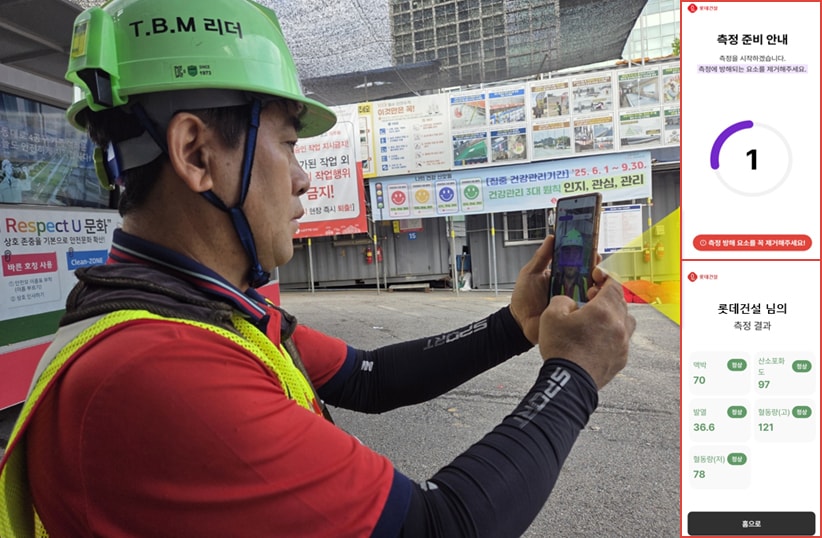 이번에 개발된 앱은 다음달 중 롯데건설 전 현장에 적용할 계획이다. 해당 기술은 스마트폰에 내장된 카메라 안면인식을 통해 맥박에 따라 변하는 피부색을 감지해 생체신호를 측정하는 것이다.