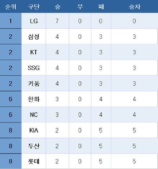 [프로야구] 중간 순위(29일)