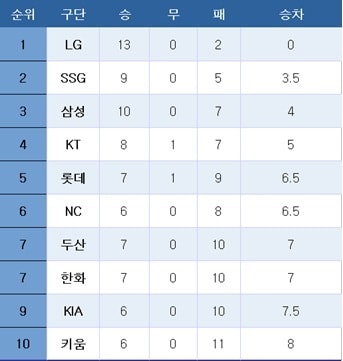 [프로야구] 중간 순위(11일)