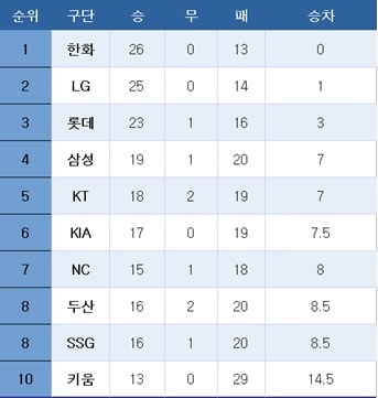 [프로야구] 중간 순위(10일)