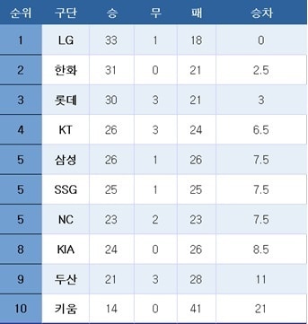 [프로야구] 중간 순위(25일)