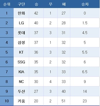 [프로야구] 중간 순위(17일)