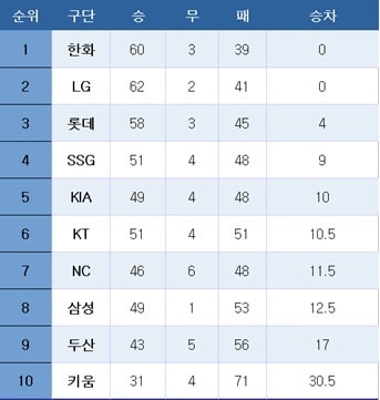 [프로야구] 중간 순위(6일)