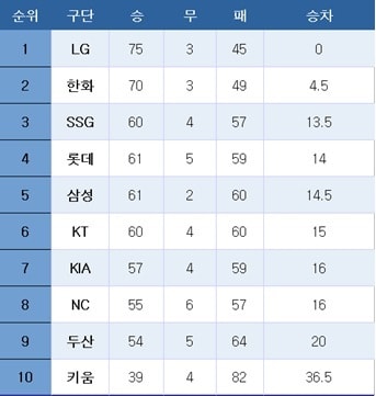 [프로야구] 중간 순위(29일)