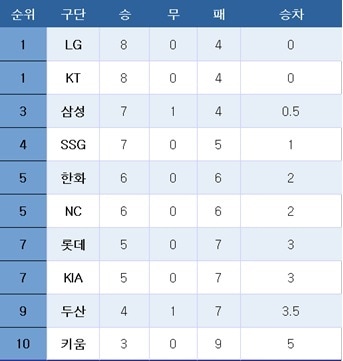 [프로야구] 중간 순위(11일)