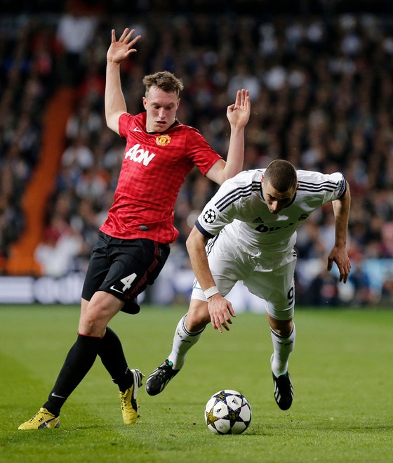 맨유의 필 존스(왼쪽)가 레알 마드리드 의 공격수 카림 벤제마의 돌파를 막고 있다. ©AFP=News1