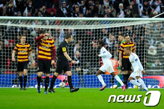 25일(한국시간) 영국 런던 웸블리 스타디움에서 열린 '2012~2013시즌 잉글랜드 캐피털 원 컵' 결승에서 브래드포드 선수들이 스완지시티에게 세번째 골을 허용한 뒤 허탈해 하고 있다. © News1 조재현 기자
